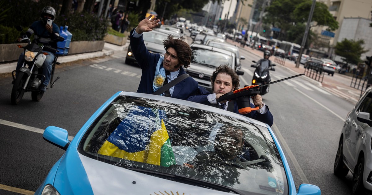 Quiere ser concejal de Florianópolis y pregona las ideas libertarias del presidente argentino.Con peluca, patillas y banda presidencial, se pasea en un auto ploteado con los colores celeste y blanco.