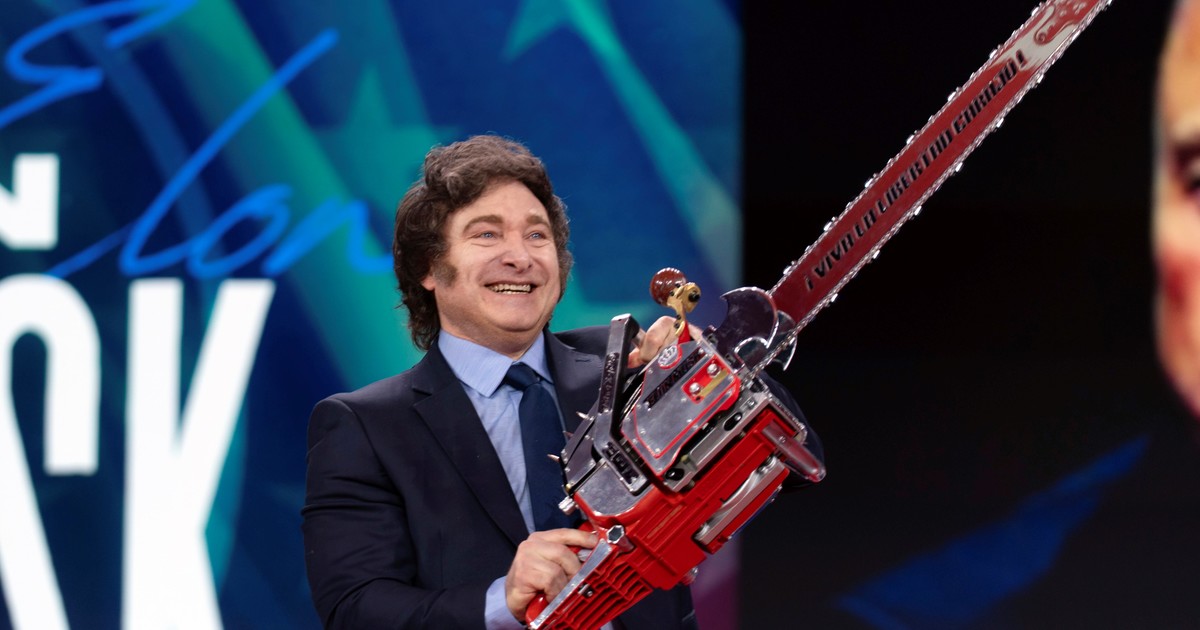 • Ayer, se vio con la jefa del FMI y con Elon Musk, a quien le regaló una motosierra.