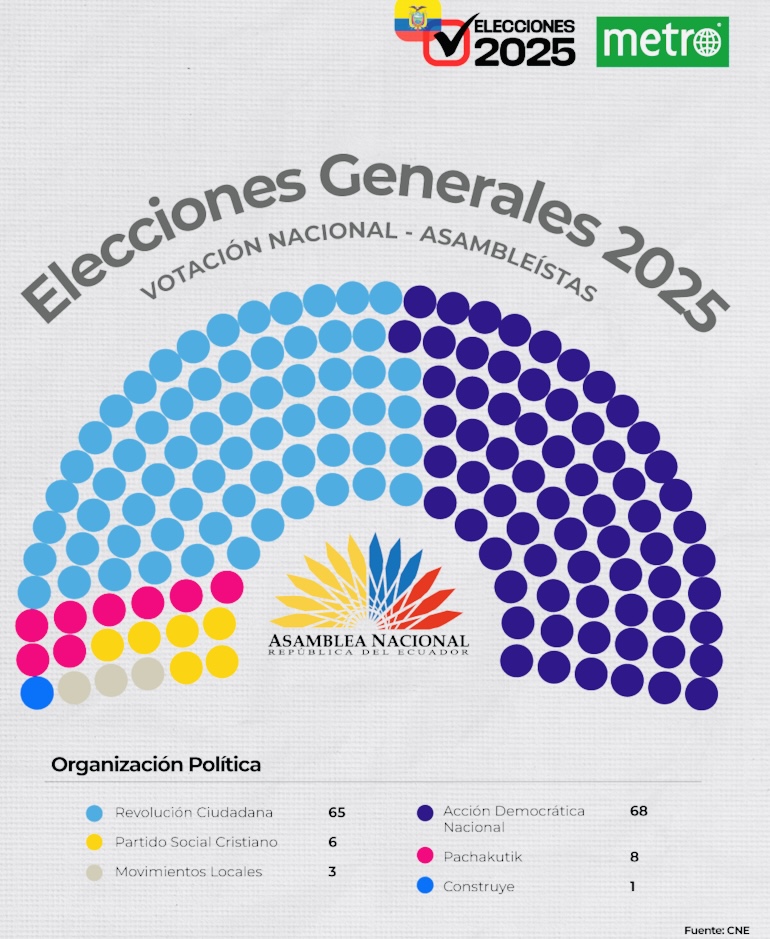 Londres.-El joven Presidente de Ecuador Daniel Noboa obtuvo 68 escaños de los 151 Asambleístas, siendo el mayor número seguido por la Revolución Ciudadana con 65 según datos oficiales de la página del CNE. Mientras que Pachacutik avanzo a poner 8 y los del PSC 6, Movimientos Locales 3 y Construye 1 Asambleísta.