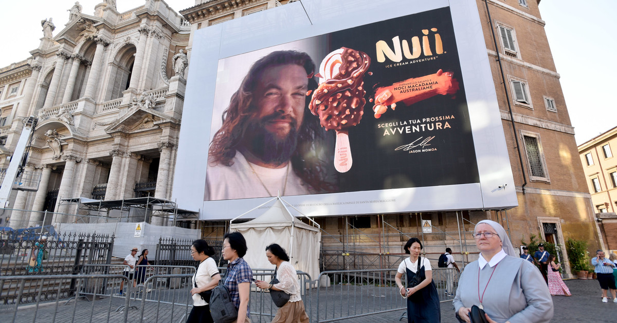 Dos maxipantallas de 15 x 10 metros y 9 x 20 cubren la fachada posterior el frente del antiguo templo, venerado por los romanos y el propio Francisco.Escándalo ¿sí o no? Las reacciones son diversas. Pero hay una explicación.