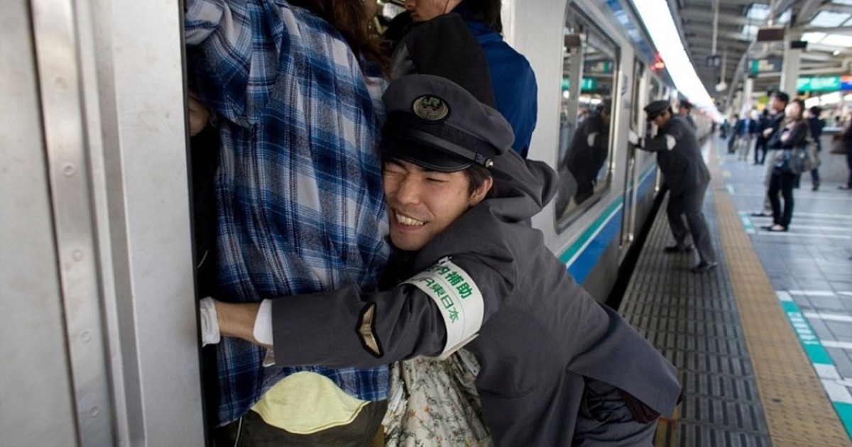 • Un grupo entrenado introduce a la gente en los vagones del transporte público de Tokio a los empujones.